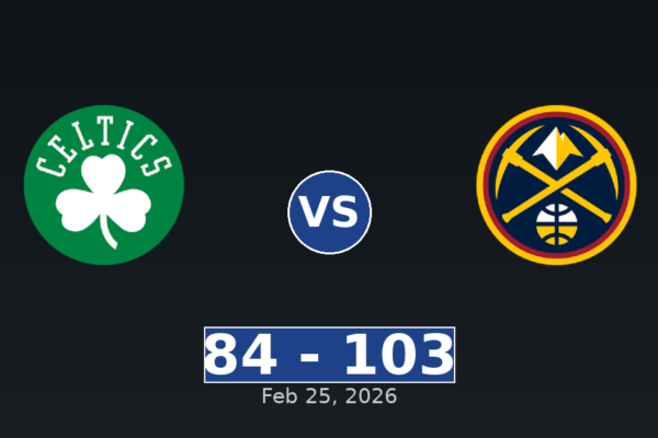 The Denver Nuggets defeated the Boston Celtics 103-84 on February 25, 2026 at Ball Arena. A crowd of 19,763 witnessed the Denver Nuggets secure the victory by 19 points. Game Information Quarter-by-Quarter Scoring Team Q1 Q2 Q3 Q4 Total DEN 21 26 30 26 103 BOS 24 24 19 17 84 Officials Karl Lane (Referee),…