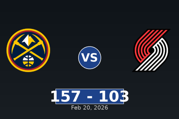 The Denver Nuggets secured a 54-point victory against the Portland Trail Blazers on February 20, 2026, winning 157-103. The game took place at Moda Center with 18,566 in attendance. Game Information Quarter-by-Quarter Scoring Team Q1 Q2 Q3 Q4 Total POR 27 26 32 18 103 DEN 41 41 43 32 157 Officials Curtis Blair (Referee),…