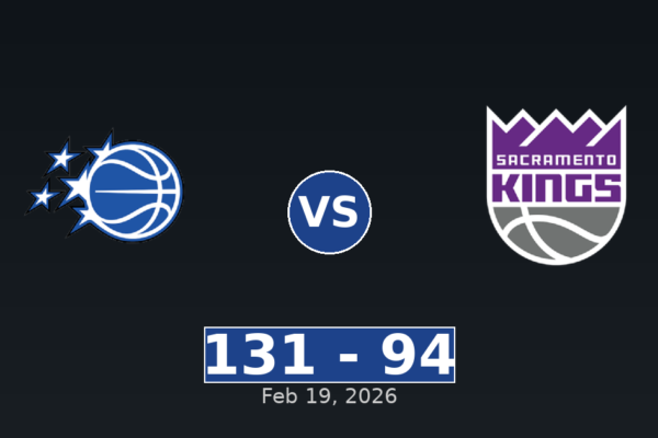Playing at Golden 1 Center on February 19, 2026, the Orlando Magic topped the Sacramento Kings 131-94. The Orlando Magic executed their game plan effectively before 16,544 fans. Game Information Quarter-by-Quarter Scoring Team Q1 Q2 Q3 Q4 Total SAC 28 27 29 10 94 ORL 18 46 38 29 131 Officials Curtis Blair (Referee), Che…