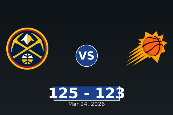 The Denver Nuggets secured a 2-point victory against the Phoenix Suns on March 24, 2026, winning 125-123. The game took place at Mortgage Matchup Center with 17,071 in attendance. Game Information Quarter-by-Quarter Scoring Team Q1 Q2 Q3 Q4 Total PHX 35 22 38 28 123 DEN 28 39 30 28 125 Officials Nick Buchert (Referee),…