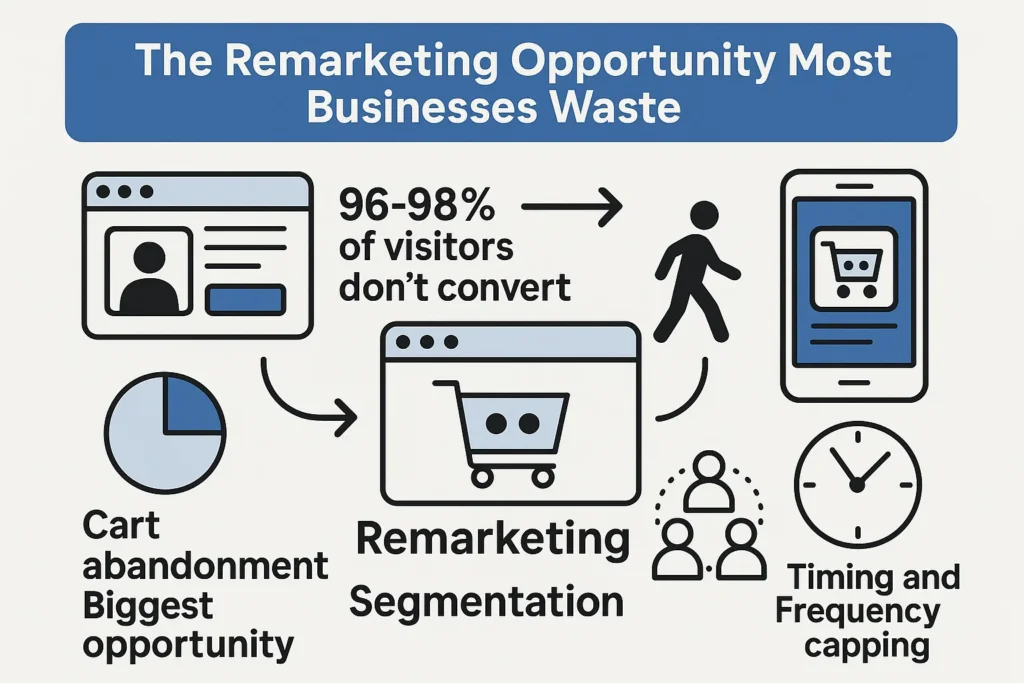 Here’s a reality check: 96-98% of people who visit your site don’t convert on their first visit. They browse, they read, they consider—then they leave. Most businesses treat that as the end of the story. Smart businesses recognize that’s just the beginning.
